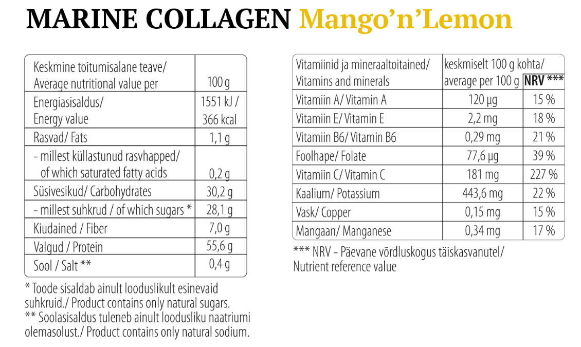 Ingredients: Hydrolysed marine collagen (FISH) (60%), freeze-dried mango puree flour (30%), freeze-dried quince (Cydonia oblonga) flour (5%), freeze-dried lemon puree powder (2%), freeze-dried Camu-Camu powder.